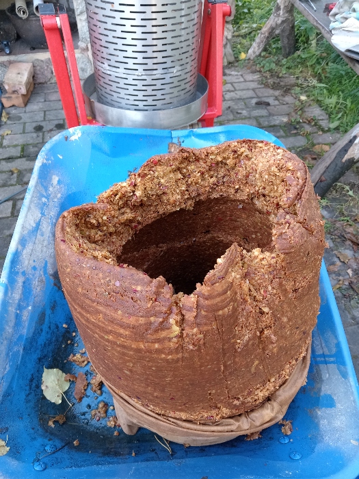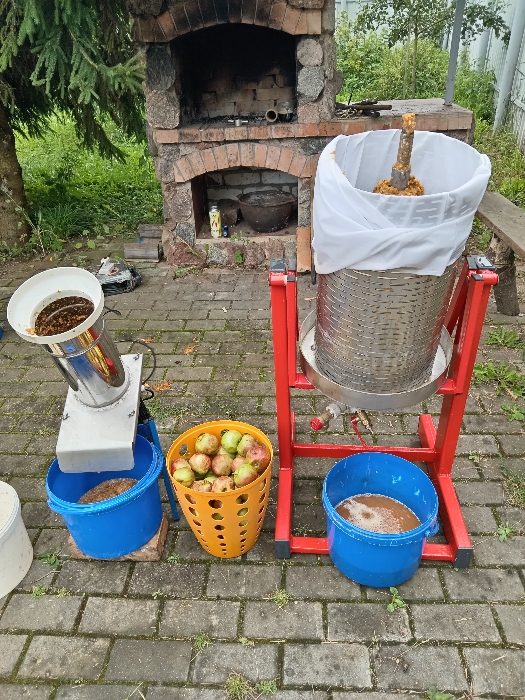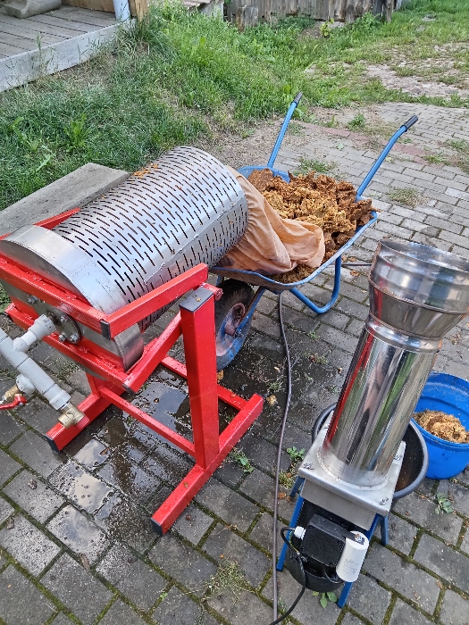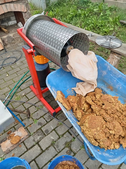 Разовая загрузка мезги - 40 литров. Выход сока 25-30 литров с одной загрузки.