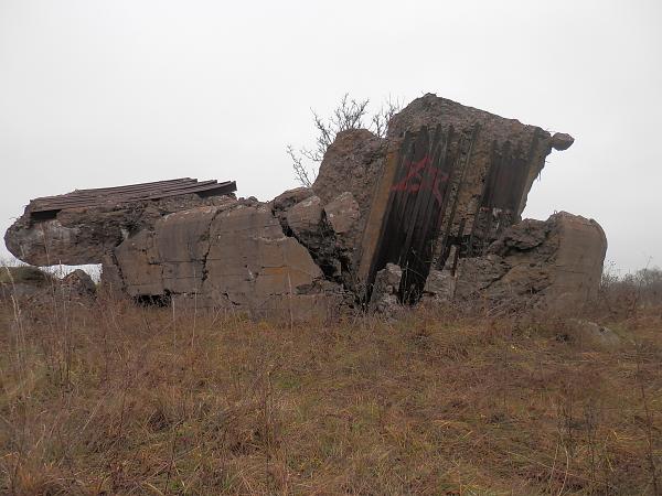 Вдали видны два дота. Сначала направляемся к дальнему. Он так же взорван. На стоящем торчмя потолке кто-то нарисовал красную звезду. В голове не укладывается, какой мощности взрыв мог совершить такие разрушения.