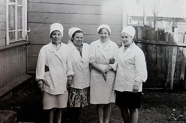 Слева направо стоят кухонная рабочая (имя и фамилия неизвестны), помощник повара Нина Грабовская, кухонная рабочая Нина Хватынец, буфетчица Клава Горанская. Снимок 1970 года.