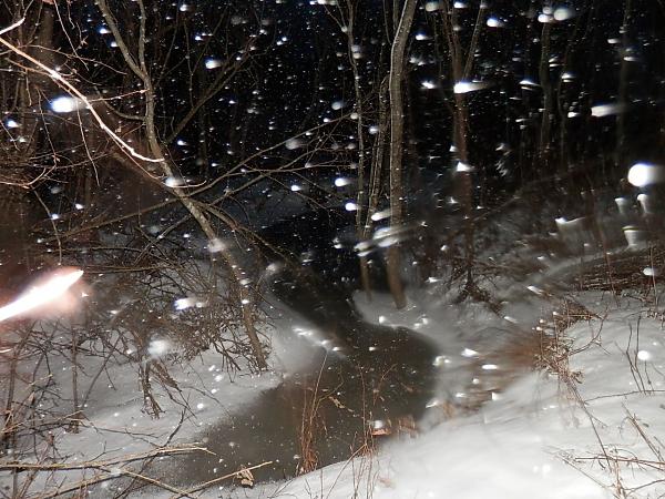 Виден снегопад! А при обычной фотосъёмке пограничный ручей выглядит совсем прозаично.