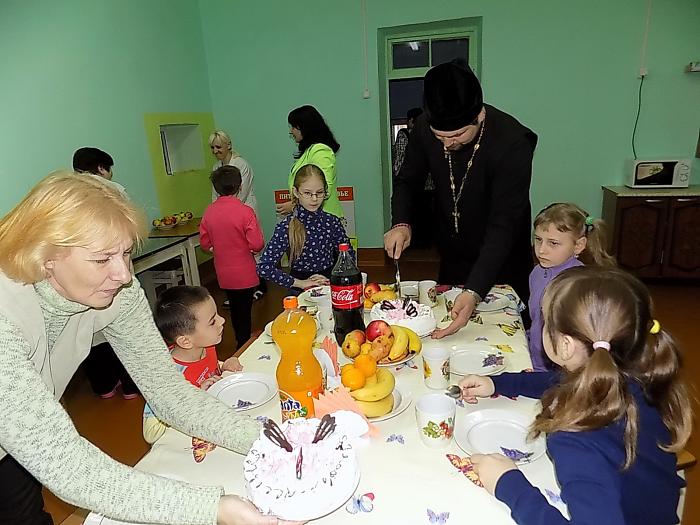 Мне предстоит двойная нагрузка: и празднично обедать, и одновременно фиксировать интересные моменты празднества. Вот один из них: не заместитель директора Центра воспитанницу тортом потчует, а наоборот.