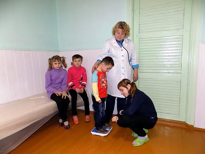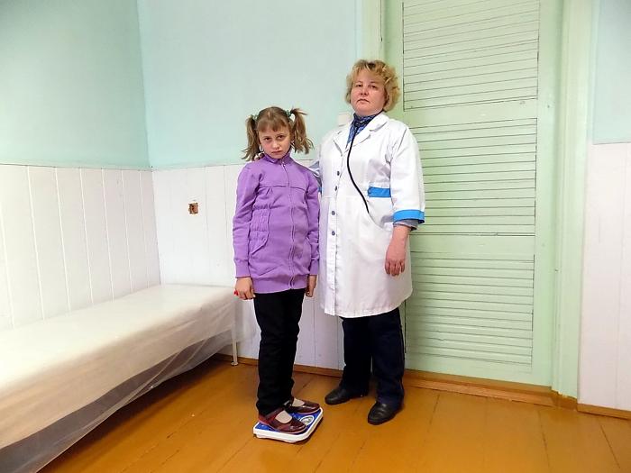 Никак не мог найти шестого воспитанника – четвероклассницу Катю из Велевщины. Случайно заглянул в медпункт, а её взвешивает медсестра Елена Крумликова.